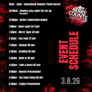 Berks County Barber Expo + Add to Google Calendar + iCal / Outlook export 00 days 00 hours 00 minutes 00 seconds Date Mar 08 2026 Time March 28: 1:00pm - 6:30pm 1:00 pm - 6:30 pm Location South Hall Category Morgantown Center Organizer Public Event Share this event Directions & Parking